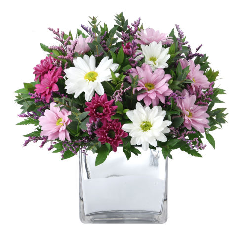 Delightful daisies and roses in a stunning cube vase, accented with delicate Limonium and greenery. A perfect gift!