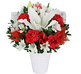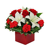 A festive and patriotic arrangement of red and white with fun sparkly ting tings and red and white curly ribbon! Glowing Hearts features red carnations, white lilies, red gerbera and more!