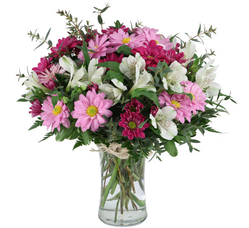 Show them how your Love Blossoms with this splendid bouquet! Pink and mauve daisies are complimented beautifully with white alstroemeria and tasteful greenery. Presented in a flared glass vase with a twine bow.