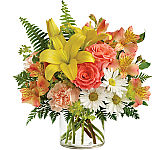 This bright and vibrant bouquet is Sweeter Than Candy! Featuring sunny yellow lilies, fiery orange roses, hot hot pink carnations and brilliant purple stock!