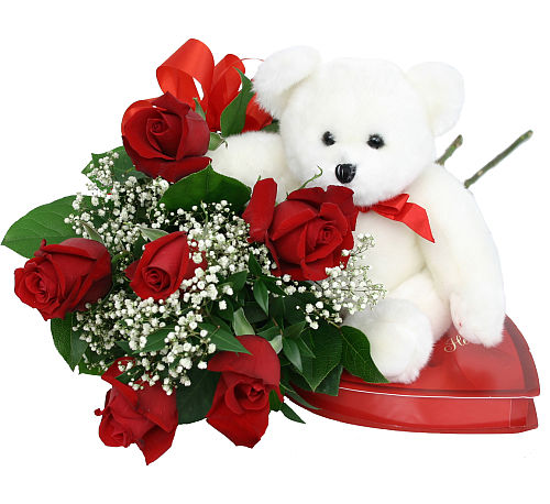 Six premium red roses with baby's breath, greens and matching bow, presented with a box of delicious chocolates and a cuddly white plush bear. Wow! Please note that heart-shaped box of chocolates and teddy bear will vary regionally and seasonally across Canada.