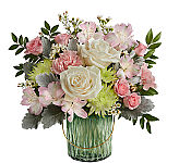 Celebrate loving years together with this romantic arrangement. Featuring six white or cream roses with pink alstroemerias and delicate baby's breath, expertly designed in glass ginger vase.