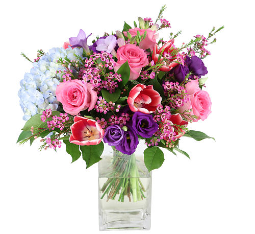 Express your love & gratitude simply and affectionately with this perfect arrangement of pink, lavender, vibrant and soft mixed blooms. Flowers include roses, freesia, lisianthus and more. Each flower is carefully crafted into a tender gift of love for Mother's Day.