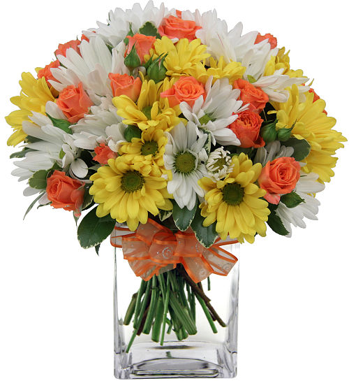 Make it a 'best day' with our pretty gift of yellow, white and orange flowers expertly arranged in a stylish clear glass cube vase. Featuring yellow and white daisies arranged with pretty orange spray roses and greenery.