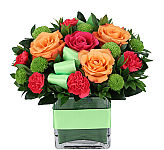 Experience 'Radiant Gems' – a stunning arrangement featuring a captivating blend of yellow and orange blooms, highlighted by the allure of purple Matsumoto asters, all elegantly presented in a leaf-lined vase. Crafted with the essence of art rainbows, ignited by passion, fueled by hope, and woven together with compassion, this arrangement is a kaleidoscope of emotions brought to life.