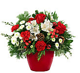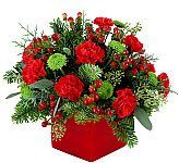 This classic design is full of holiday greens with a touch of white, carnations. frosted pinecones and silver ornaments give this piece an enchanting holiday feel.