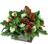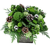 This frosty arrangement is certainly cool! All white blooms and silver decore in a silver sparkly vase is the perfect gift for any holiday home!