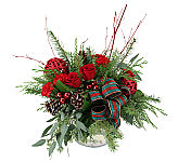 Finding the perfect gift for someone can be hard. Relieve some of the holiday stress with the Gracious Gift Bouquet. A lovely design featuring red roses, white carnations, red ornaments and holiday ribbon.