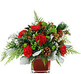 A holiday-red vase holds a beautiful floral design of lush red roses, with pink lisianthus, pink waxflower, golden ornamental balls, ample seasonal greenery, delicate organza ribbon and decorative dried branches. A stylish addition to any holiday decor.
