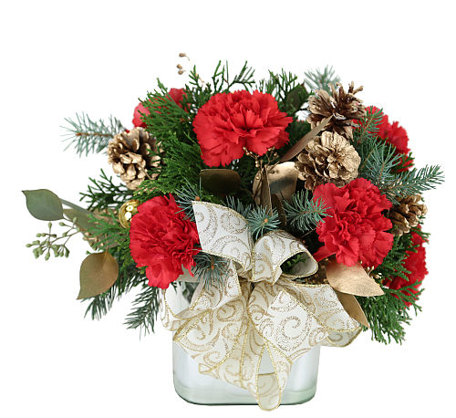 A season of celebration, friends and family is made even more precious with this golden floral gem. Featuring red carnations arranged with golden ornamental balls, gold frosted seeded eucalyptus, golden ribbon and ample seasonal greenery.