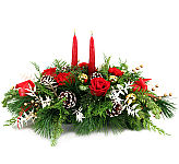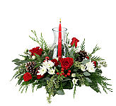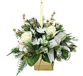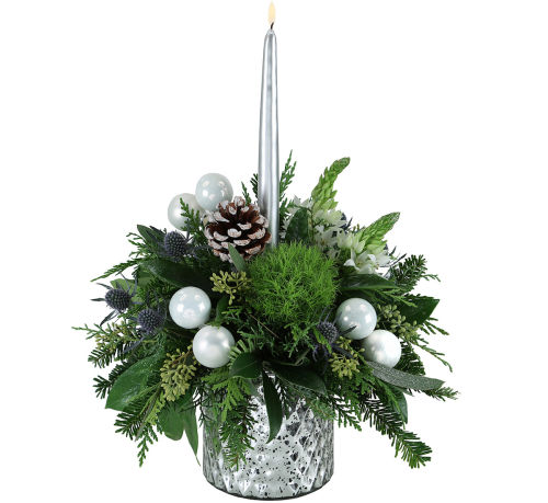 This frosty bouquet is displayed in a stunning silver vase with white ornament balls, frosted pinecones, star of Bethlehem, blue thistle and a single silver candle!
