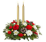Traditional all red Christmas centerpiece with two red taper candles and matching red bow. This arrangement includes assorted seasonal greenery, red hypericum berries or faux berries, red balls, holiday decor and frosted pine cones.