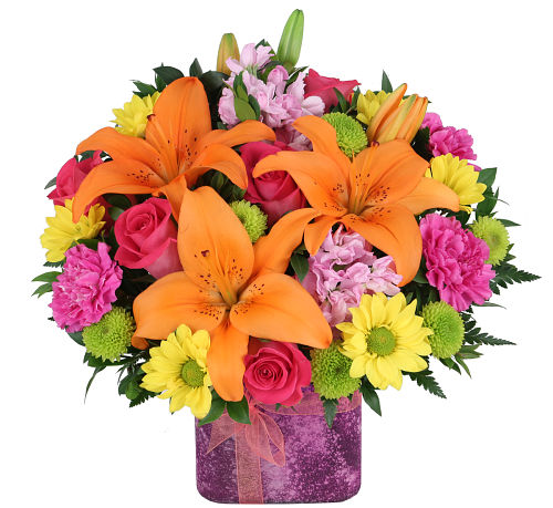 This arrangement is full of colour and life! Bright orange lilies, hot pink carnations and roses, yellow daisies, pink stock and green button poms. Designed in a striking pink vase and a cute pink bow!