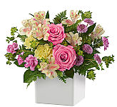 Immerse yourself in enchantment with our "Blooming Bliss" arrangement. Nestled in a leaf-lined vase, it showcases peach roses, white lilies, yellow carnations, and mauve daisies in a symphony of colours. Radiant peach roses and pristine white lilies steal the spotlight, while cheerful yellow carnations and whimsical mauve daisies add bursts of sunshine and charm. Lush greens provide a natural backdrop, enhancing the vibrancy of the blooms. This captivating tableau captures the essence of spring, bringing joy and rejuvenation to any space.