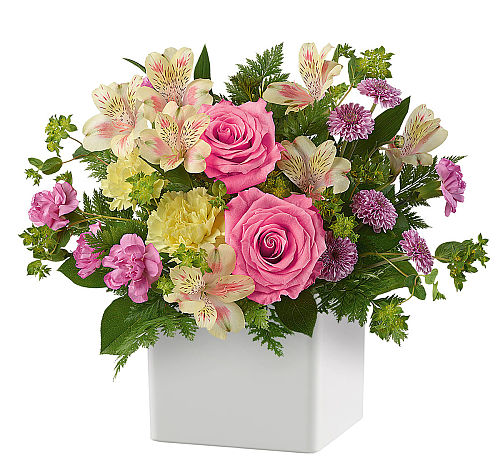 Step into the "Garden Gala," where floral elegance meets vibrant charm. In a sleek white cube vase, this enchanting arrangement celebrates nature's beauty and sophistication. Soft pink roses unfold gracefully, accompanied by sunny yellow alstroemeria and carnations, infusing the display with warmth and joy. Delicate pink mini carnations add a whimsical touch, while deep purple buttons provide a rich contrast. Bupleurum foliage weaves throughout, enhancing the natural beauty of the blooms. Perfect for any occasion, this ensemble elevates ambiance and captivates with its beauty, whether on a tabletop or mantel.