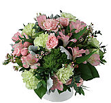 Popular Spring tulips in white and pink, expertly arranged in a clear glass vase with added foliage.