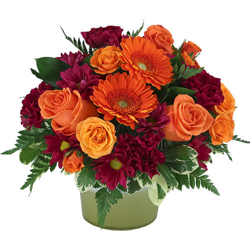 Stunning mauve carnations and daisies set off by fiery orange spray roses, and orange gerbera. A beautiful fall arrangement for any home!