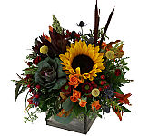 This rustic arrangement features sunflowers, roses and more in a chic white cube vase. A lovely pick-me-up for a crisp fall day.