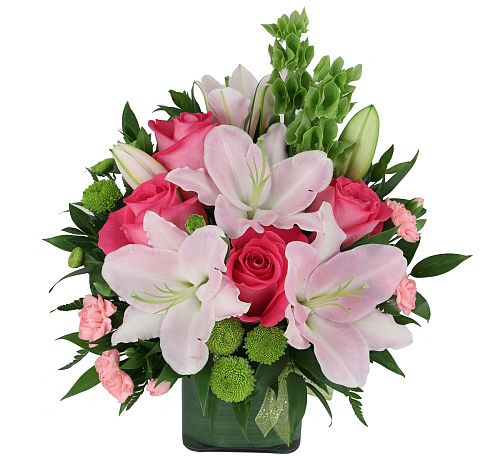 For your cutie pie in your life! Leaf lined vase to include pink Asiatic lilies, roses, mini carnations and more!