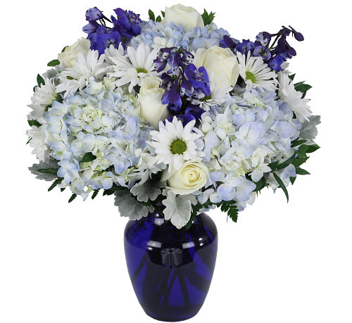 Ocean Whisper features the cool and calming colours of the ocean. Crisp white roses and daisies, soft blue hydrangea and deep blue delphinium are presented beautifully in a ravishing blue vase.