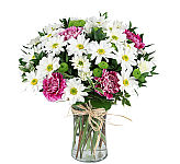 Celebrate the Beauty of Spring with this beautiful arrangement! Designed in a rustic wooden container with pink tulips, pink carnations, yellow freesia and more! Topped with a twine bow.
