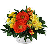 This stunning spring flower arrangement is a beautiful combination of Stargazer lilies, carnations, daisies, and other delightful blooms. The lilies' exotic fragrance adds an extra element of elegance and sophistication to the arrangement. Whether placed on a table or given as a gift, this arrangement is sure to bring joy and beauty to any space it inhabits.