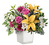 This beautiful spring bouquet is sure to bring happiness into anyone life! Bright yellows and pinks with carnations, daffodils, tulips and more!