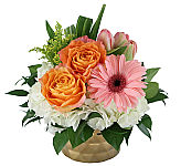 A magical combination of Spring flowers including freesia, tulips, gerbera, daisies, carnations, wax flower and statice. The enchanting part of this arrangement is how the pink, purple, lavender, yellow and green combine so effortlessly to create a lovely spell for the eyes.