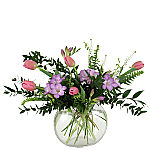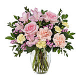 Regal Romance is a floral masterpiece exuding sophistication and grace. Delicate peach roses steal the spotlight, complemented by soft pink alstroemeria and carnations. Lavender mini carnations and pink daisies add regal charm and whimsical allure. Lush greens provide a verdant backdrop, enhancing the arrangement's natural beauty. Perfect for any occasion, let this arrangement be the crowning jewel of your space, captivating all who behold its beauty.