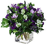 An uplifting Spring flower arrangement in a natural basket, featuring a gorgeous combination of fresh blooms in lavender, pink, orange, blue, yellow and purple. Seasonal floral varieties include roses, snapdragons, tulips daffodils and more.