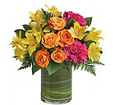 Welcome to Coastal Retreat, where the beauty of the seaside comes alive in a captivating floral arrangement. This exquisite composition captures the essence of a tranquil beach escape, immersing you in a sense of serenity and relaxation. The arrangement features vibrant sunflowers, their radiant yellow petals reminiscent of the sun's warm embrace. Paired with lively orange gerbera daisies and charming orange carnations, these blooms evoke the vivid colours of a coastal sunset.