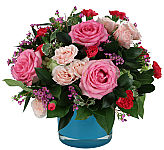 This striking arrangement may remind you of stargazing. With a glass cube vase, yellow roses, pink lilies, queen anne's lace, and more! Please note that the exact container may not be available in all cities across Canada - and may be substituted with a suitable alternative.