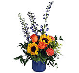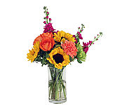 A feel good flower arrangement of bright yellow lilies, with pink roses and soft pink Gerbera daisies, with just a hint of complementary greenery and delicate pink flowering blooms. A fantastic gift, perfect for just about any occasion or sentiment.