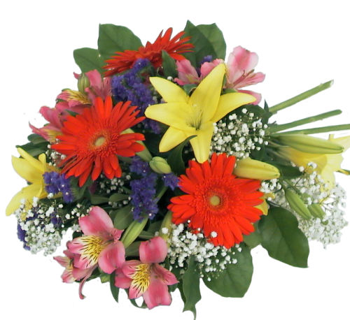 This rainbow-coloured fresh flower bouquet includes Gerbera daisies, alstroemeria, lilies, statice and baby's breath. Perfect.