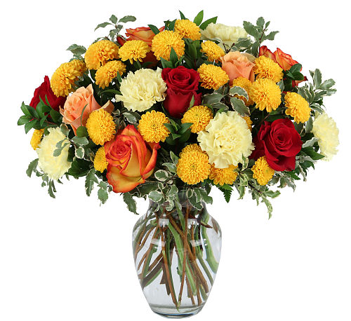This delightful fall bouquet is the perfect representation of a crisp fall morning. golden yellow mums are paired beautifully with light yellow carnations and red, orange and peach roses. Simply stunning.