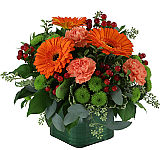 This rustic arrangement features sunflowers, roses and more in a chic white cube vase. A lovely pick-me-up for a crisp fall day.