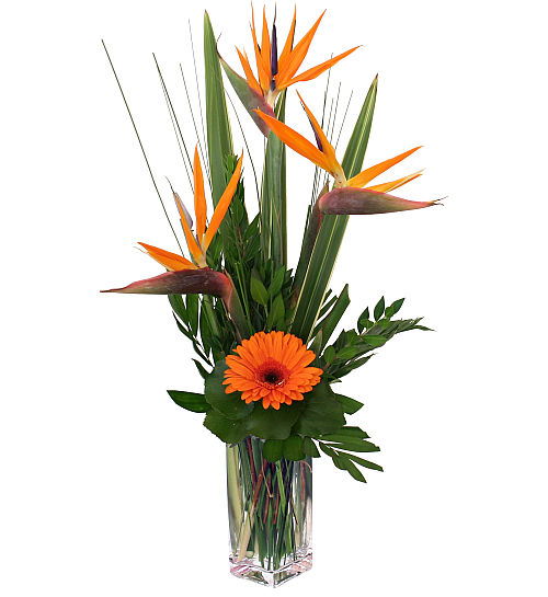 Dramatic presentation of 3 or more Birds of Paradise, expertly arranged with lively foliage accents and a solitary bold orange gerbera. A great, affordable way to send tropicals.