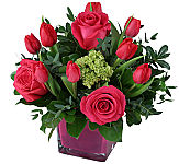 Display your level of devotion this with this radiating display of deep red flowers. Mums, Carnations and more illuminate a clear glass vase. An entirely original design for that special someone on Valentine's Day.