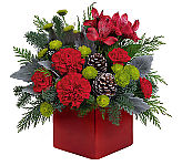 Filled to the brim with red mini carnations, white mums, frosted pinecones, berries, and a holiday bow, this arrangement is sure to please!