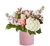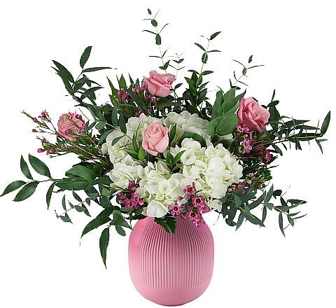 A classy beautiful arrangement of pink roses, white hydrangea, waxflower and more! Perfect for the one you love.
