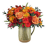 The FTD® Golden Autumn™ Bouquet pops with the bright and beautiful colors of the fall season ahead to send your warmest wishes straight to your special recipient's door! Burgundy mini carnations are a standout choice arranged artistically amongst eye-catching butterscotch daisies and peach spray roses, accented with lush greens. Presented in a clear glass vase, this harvest bouquet is ready to add to the treasured moments of the fall season ahead, making this a perfect thank you, thinking of you, or Thanksgiving Day gift.