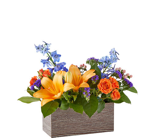 A vibrant celebration of nature's beauty. Within its charming box, find a delightful blend of Light Blue Delphiniums, Peach Lilies, and Orange Spray Roses, radiating warmth and vitality. Accented by Purple Statice and Pink Hypericum berries, this arrangement exudes sophistication and whimsy. Enhanced by lush greenery, it captures the essence of a sun-kissed orchard in full bloom, sure to enchant any space with its radiant charm.