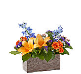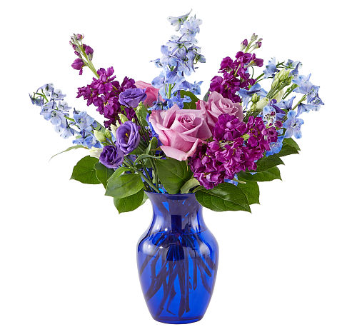 Introducing "Twilight Glow," a mesmerizing floral arrangement that captures the serene beauty of dusk in a charming blue vase. Lavender Roses gently unfurl their petals, exuding an air of tranquillity, while Blue Delphiniums stand tall like dusky shadows against the evening sky. Deep Purple Stock adds depth to the arrangement, complemented by the delicate blooms of Purple Lisianthus, reminiscent of Twilight's soft hues. Lush greens cascade gracefully, adding texture and completing the enchanting scene. "Twilight Glow" is a captivating composition that brings the magic of twilight indoors, infusing any space with an aura of peace and elegance.
