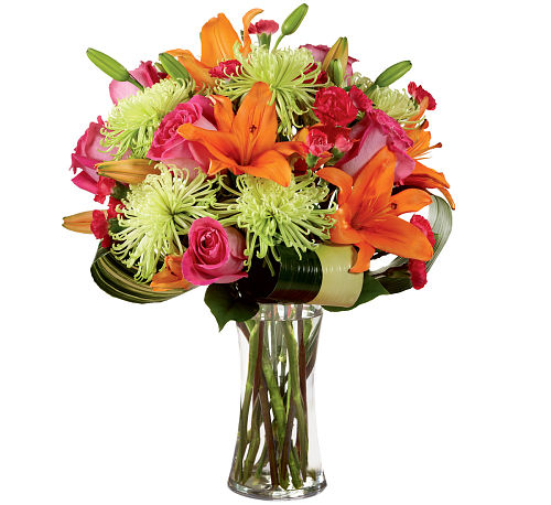 Is it time to celebrate their birthday? This fresh flower arrangement has you covered. Hot pink bi-coloured roses, orange Asiatic Lilies, green Fuji Chrysanthemums, hot pink mini carnations, tropical leaves, and lush greens are brought together to impress, presented in a clear glass vase. Bright, beautiful, and ready to get the party started, this bouquet creates a unique surprise to absolutely delight your recipient with each sunlit bloom.