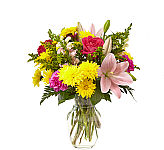 Blossoming with a blushing grace and casual appeal your recipient will adore, this fresh flower arrangement will persuade them to see the beauty of all that surrounds them. Pink Asiatic Lilies are the star of this bouquet surrounded by hot pink carnations, hot pink roses, yellow solidago, green button poms, and lush greens, arranged to perfection in an oval woodchip basket to give it a chic country garden styling. A lovely way to say thank you, get well, or congratulations!