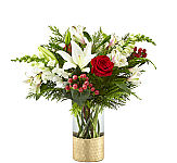 Add a touch of sophistication with the jewel tones of the Berry Merry Bouquet. This dynamic arrangement brings new life to classic stems while gerbera daisies and carnations showcase a rich red palette fit for the holiday.