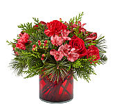 The "Cheer In The Air" arrangement is like a holiday hug in a festive ornament! This delightful display features a merry mix of bright red roses and carnations paired with fluffy white mums—perfect for that classic Christmas look. Sprinkled with red ornaments and candy canes nestled among lush evergreen branches, it’s like a miniature winter wonderland right in your home. And let’s not forget the showstopper: a red ornament container decorated with a charming village scene and frosty snowflakes. It’s the ultimate festive touch that brings all the cozy, cheerful vibes of the season. Perfect for spreading joy and adding a twinkle to any holiday celebration!