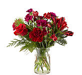 The "Gone Sledding" arrangement is a festive and cheerful holiday display, perfect for adding a touch of winter magic to any space. This arrangement features vibrant red roses and carnations paired with elegant white roses, symbolizing the warmth and joy of the season. Accented with lush greenery, such as evergreen branches, and decorative golden berries, the flowers are beautifully arranged in a charming white sleigh container adorned with gold snowflakes. The combination of colors and textures evokes the crisp, joyful spirit of a winter sleigh ride, making it an ideal centerpiece for holiday celebrations.