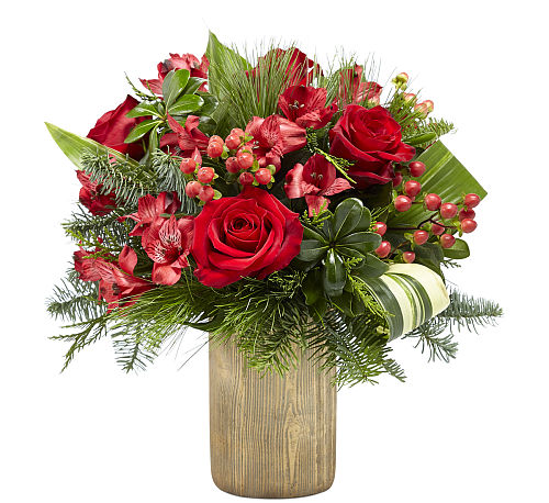 Our Take Me Home Bouquet is a stunning array of red hues and luscious greens in a gold bark ceramic vase. Comprised of red roses, red alstroemeria, red hypericum berries, aspidistra leaves, and Christmas greens, this arrangement sends a joyous, holiday greeting upon arrival.