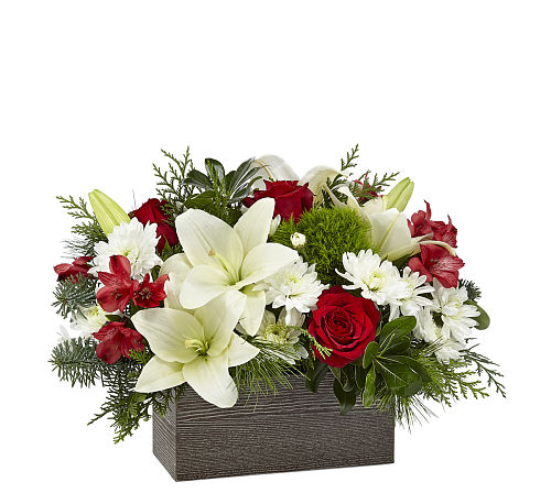Nothing says happiness and joy more like coming home to the ones you love most. An artful collection of white cushion pompons and Asiatic lilies with contrasting red roses and alstroemeria makes those precious moments this season all the more special. They all arrive in a rustic, weathered wooden rectangular box.